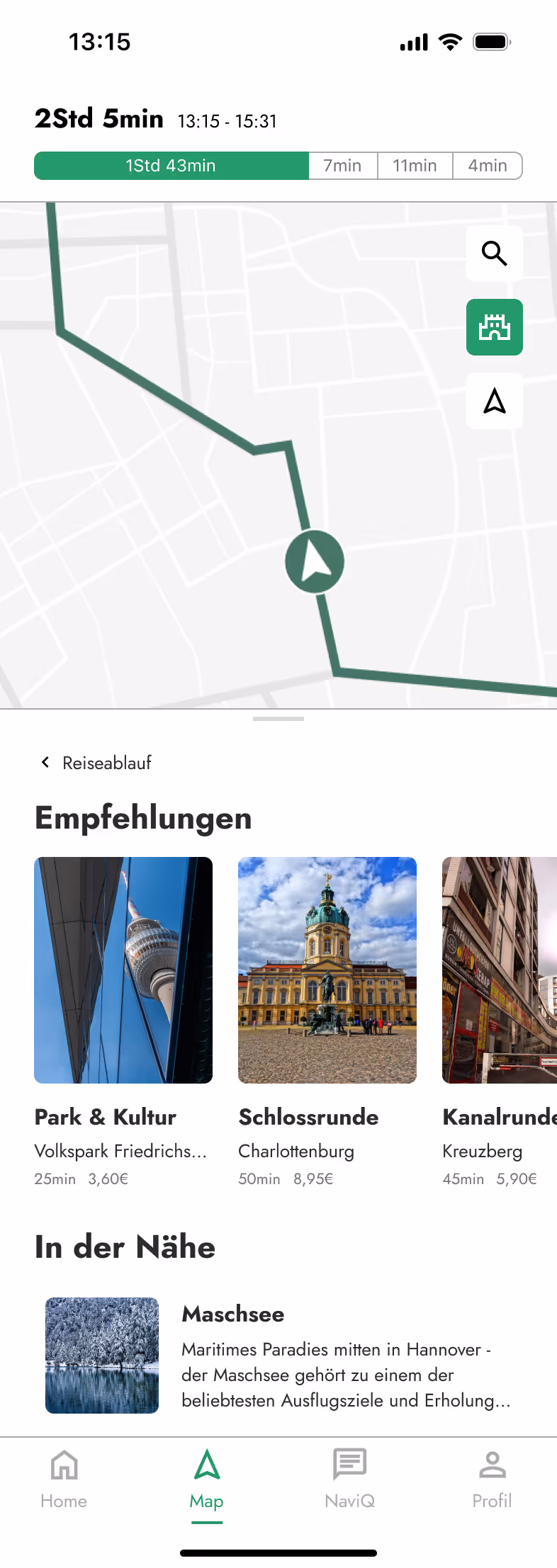 Die App zeigt den aktuellen Reiseverlauf in Echtzeit – inklusive Umstiegen, Fahrtzeiten und Position auf der Karte.