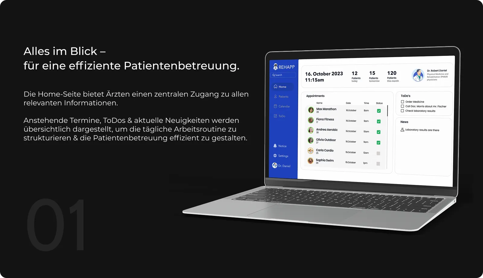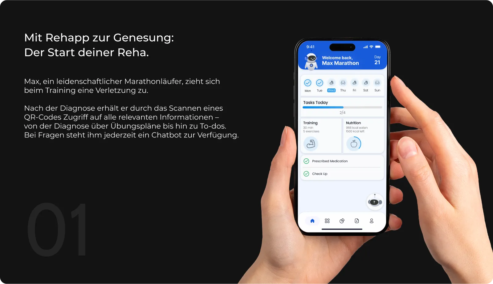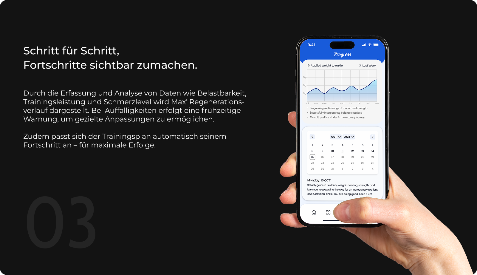 Der Trainingsbuddy zeigt die Übungsausführung auf dem Fernseher oder Handy an und korrigiert sie in Echtzeit mithilfe der Handykamera und des Smart Balance Boards. Dabei werden alle relevanten Parameter – wie die korrekte Ausführung der Übungen und die Gewichtsverlagerung – kontrolliert, um eine einseitige Überlastung zu verhindern und langfristige Fortschritte sichtbar zu machen.